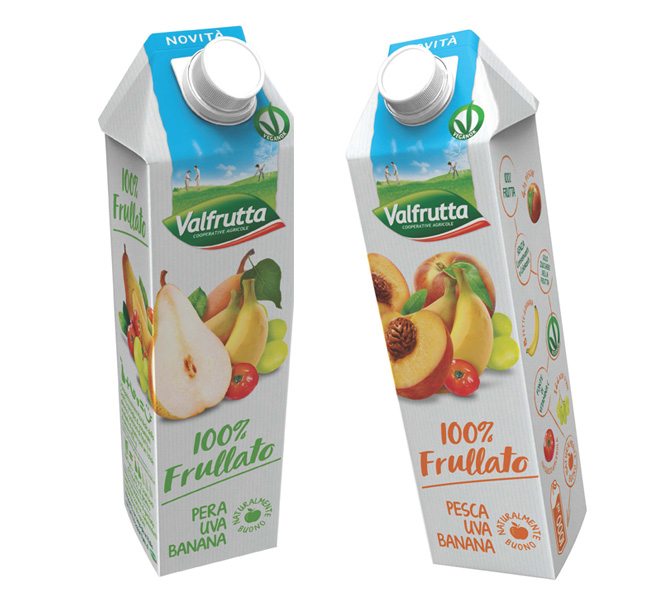 La confezione di 100% Frullato Valfrutta parla del mondo Valfrutta, della marca, dei suoi valori e della sua mission, con una comunicazione a 360° e messaggi chiari e immediati: