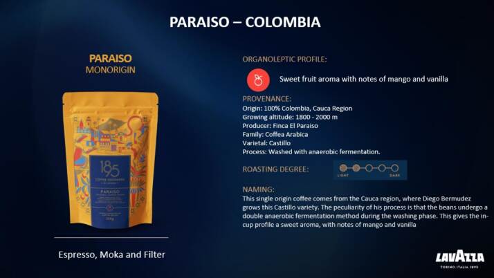 PARAISO offre un’esperienza sensoriale inconfondibile, che richiama un aroma dolce di vaniglia e delicate note di mango, una sensazione di sapori tropicali ed esotici. Il mango, simbolo dell’estate e delle vacanze, riporta alla mente immagini di luoghi incantevoli e lontani. Ed è proprio nella meravigliosa valle del Cauca nella regione andina della Colombia, nella Finca El Paraíso, cui il nome rende omaggio, che viene coltivato questo specialty coffee. Qui i chicchi vengono sottoposti a una doppia fermentazione anaerobica durante la fase di lavaggio, che conferisce al profilo in tazza un aroma dolce e fruttato. 1895 Coffee Designers by Lavazza ancora una volta si affida alle mani esperte di produttori locali per offrire le migliori esperienze di gusto. Ne nasce quindi uno specialty Coffee perfetto per ogni momento della giornata.