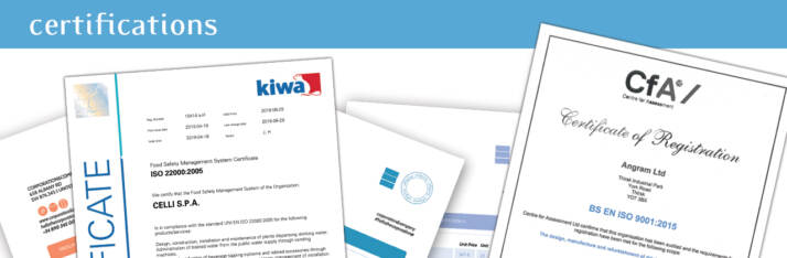 Celli, oltre alle certificazioni ISO 9001 e ISO 14001 relative ai sistemi di gestione per la qualità e l’ambiente, ha ottenuto anche la certificazione ISO 22000 sui Sistemi di gestione per la sicurezza alimentare.