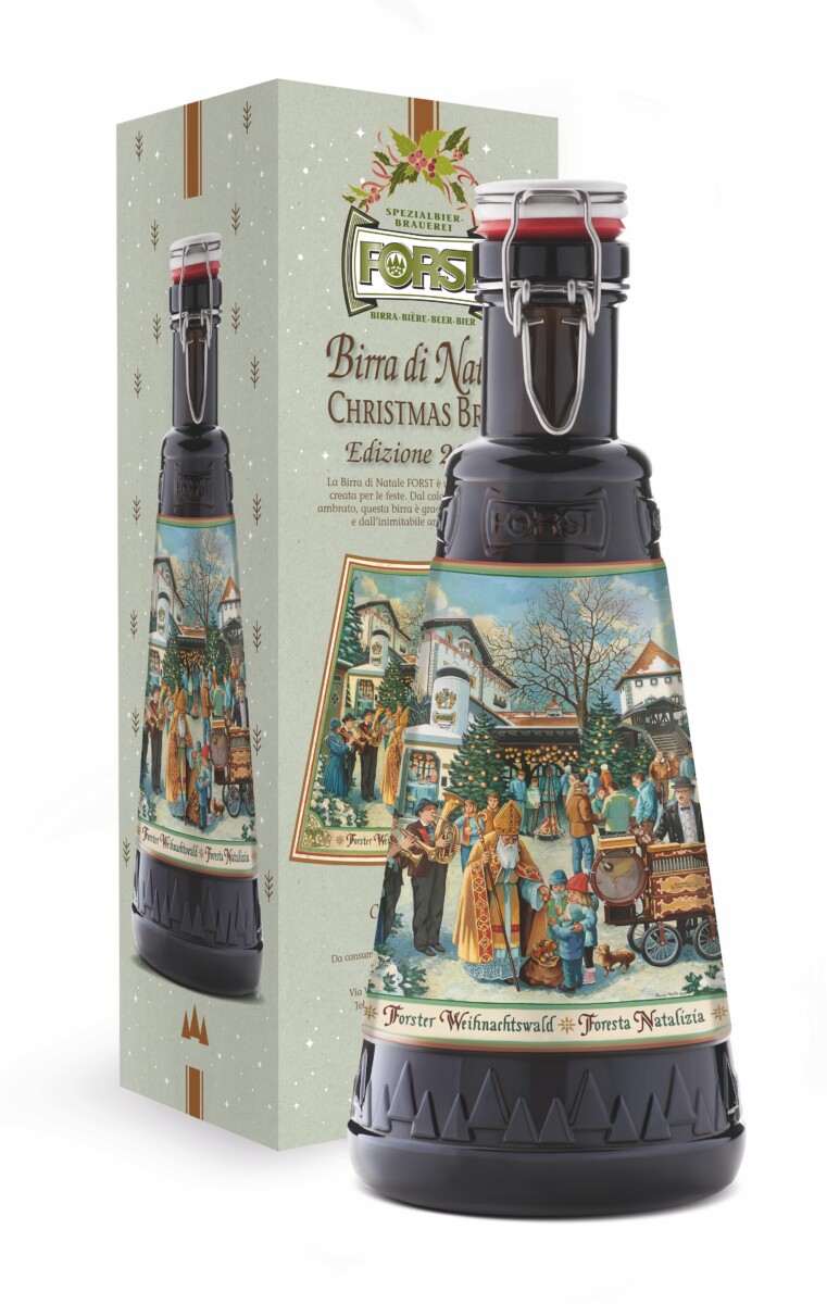 Oltre alla rinomata bottiglia da 2 litri in vetro, la Birra di Natale FORST viene commercializzata presso i grossisti FORST anche in fusti da 15 e 30 litri, nel pratico fustino “FORSTY” da 12,5 litri e in cluster da sei bottiglie da 33 cl, dal design natalizio.