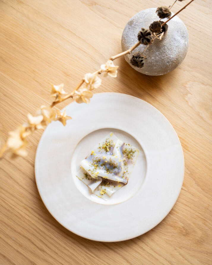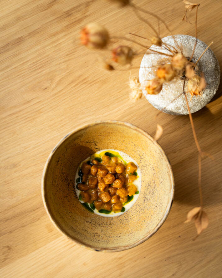 Abba è il risultato di una visione coerente e contemporanea, una cucina etica, naturale e profondamente personale, in cui ogni elemento — dal piatto al bicchiere — concorre a costruire un’esperienza sensoriale completa, autentica e raffinata. La cantina di Abba conta oggi circa 150 etichette, selezionate tra piccole maison e produttori indipendenti, con un’attenzione particolare ai vini biologici, naturali, biodinamici e macerati. Di rilievo la selezione di Champagne artigianali, frutto di un lavoro di ricerca accurato. Anche la mise en place racconta un percorso di artigianalità: le ceramiche firmate dalla ceramista Barbara Arcieri sono realizzate a mano in gres e porcellana, pensate in dialogo con lo chef per esaltare texture, colori e armonie dei piatti.