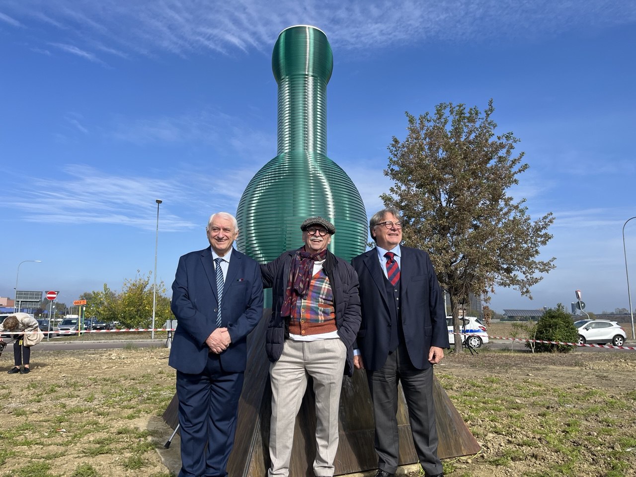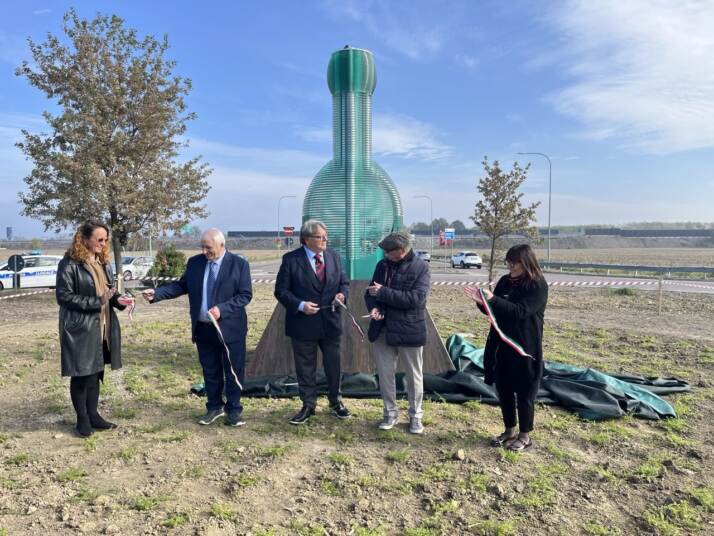 L’installazione raffigura l’iconica bottiglia disegnata da Giorgetto Giugiaro nel 1987, unica e distintiva dell’autenticità del prezioso Balsamico, rappresenta un segno distintivo riconosciuto in tutto il mondo come emblema dell’eccellenza modenese e garanzia del prodotto, è infatti l’unica bottiglia che può contenere l’Aceto Balsamico Tradizionale di Modena DOP. L’opera troverà collocazione permanente al centro della rotonda, come segno di identità, orgoglio e appartenenza della comunità locale.