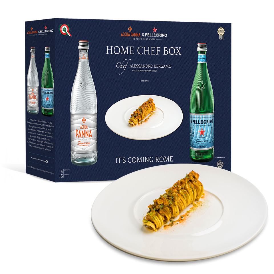 In ogni box sarà presente anche una bottiglia di Acqua Panna e/o S.Pellegrino, per esaltare la ricetta in base alle diverse caratteristiche organolettiche del piatto realizzato. Le bottiglie sono proposte nella nuova veste della Immersive Collection, esclusiva edizione limitata, creata per coinvolgere il pubblico in un’esperienza immersiva, un viaggio virtuale nel mondo delle due acque reso possibile dalla realtà aumentata: un’occasione unica per rendere ancora più ricca l’esperienza di gusto.