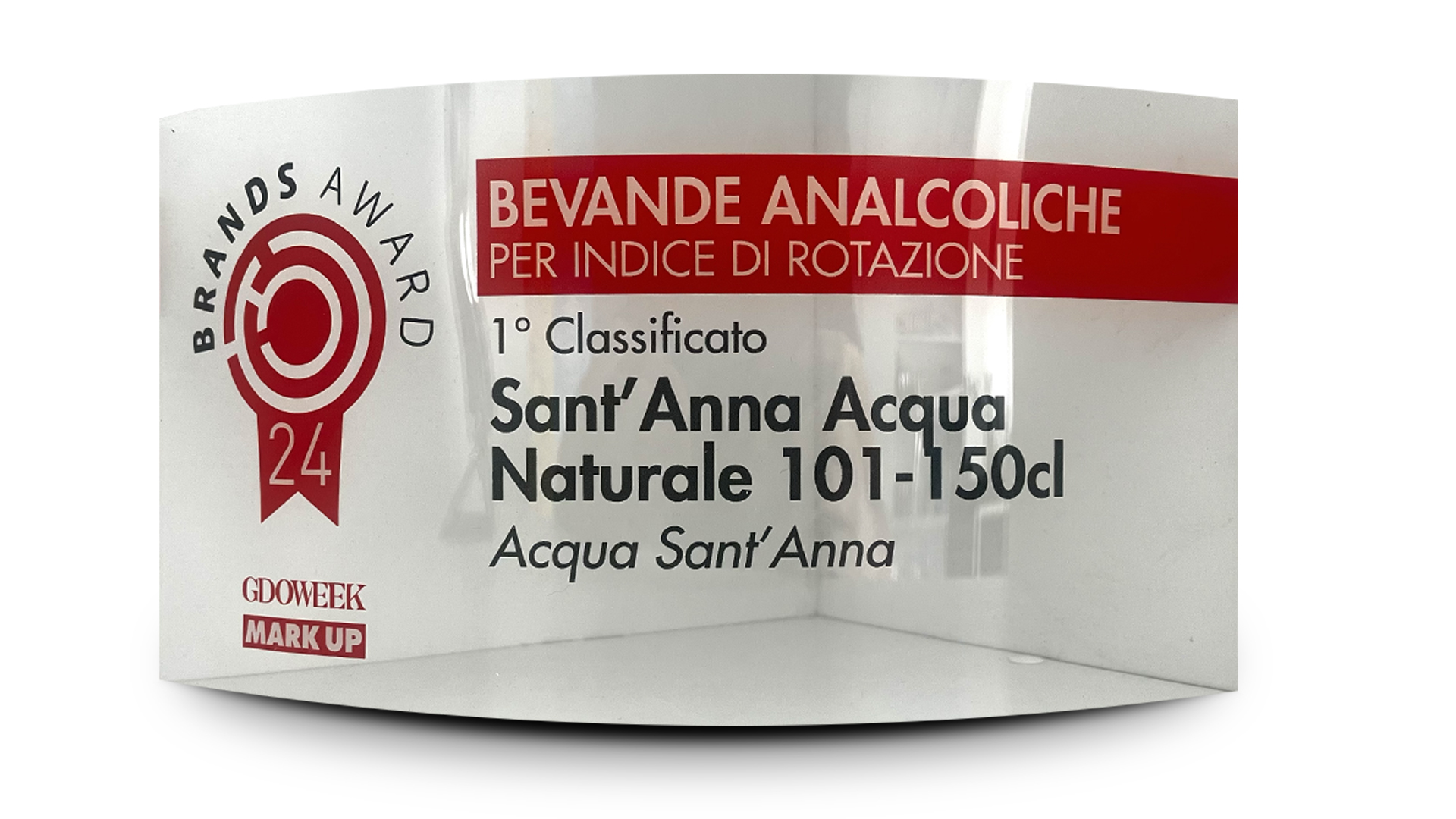 Acqua Sant’Anna naturale (formato 1,5lt), la più amata dagli italiani e brand leader del settore, si è aggiudicata il premio Brands Award 2024 nella categoria “bevande analcoliche” come miglior prodotto di marca per indice di rotazione. Conquista anche la seconda posizione nella categoria “bevande analcoliche” – prodotto esistente.