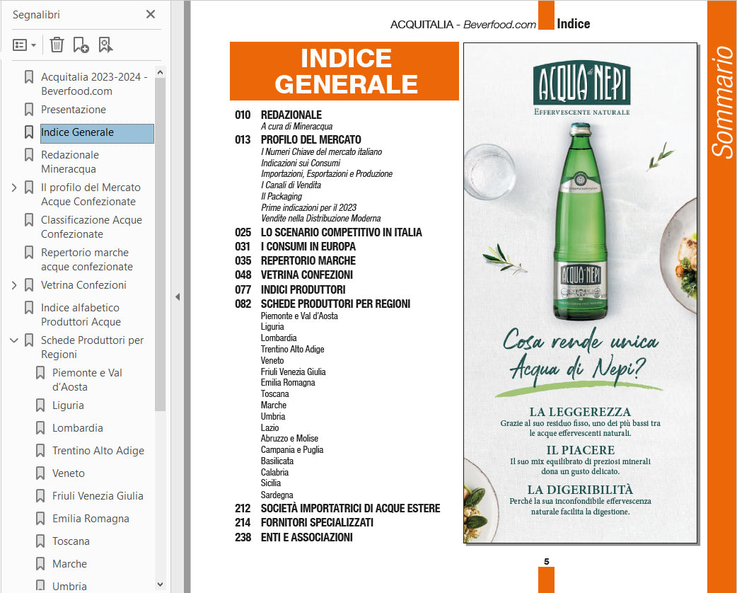 Nell’edizione 2023-24, è presente anche un’analisi statistica dei mercati europei. La pubblicazione include il Repertorio Marche Acque Minerali e di Sorgente, che elenca circa 230 marchi italiani, fornendo dettagli fondamentali per ciascuno, e una Vetrina Confezioni che mette in risalto le diverse tipologie di packaging nei vari segmenti di mercato.