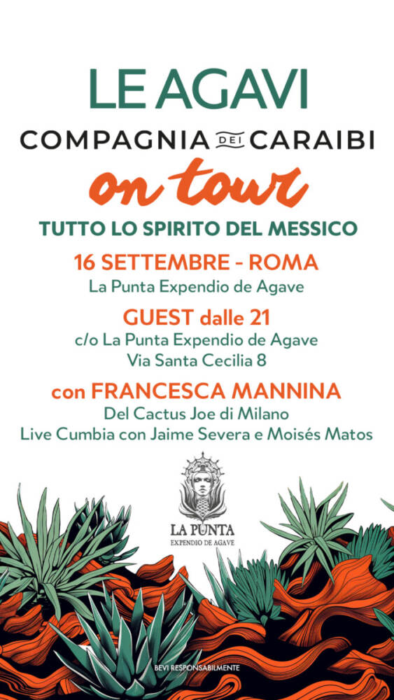 Il 16 settembre “Le Agavi di Compagnia dei Caraibi on tour” arriva a Roma alla La Punta Expendio de Agave (Via Santa Cecilia, 8). Una serata speciale – in programma dalle 21:00 a mezzanotte – per guidare alla scoperta del portfolio agavi di Compagnia dei Caraibi insieme a Francesca Mannino di Cactus Joe, Francesco Pirineo, Advocacy Manager di Compagnia dei Caraibi, e la musica di Suonomar.