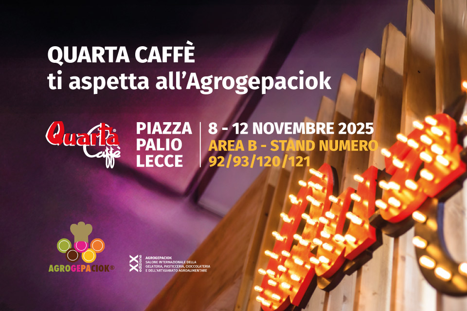 Dal 8 al 12 novembre 2025, Quarta Caffè ritorna con entusiasmo ad AGRO.GE.PA.CIOK, il Salone nazionale dell’arte dolciaria, cioccolateria, gelateria e dell’artigianato agroalimentare, che si terrà presso Lecce Fiere, Piazza Palio. Durante questi cinque giorni, l’azienda sarà lieta di presentare al pubblico le sue esclusive miscele, emblema della qualità e dell’innovazione che caratterizzano Quarta Caffè. Utilizziamo le più pregiate qualità di caffè, garantendo una freschezza impareggiabile grazie alla tostatura separata, senza l’uso del sottovuoto.