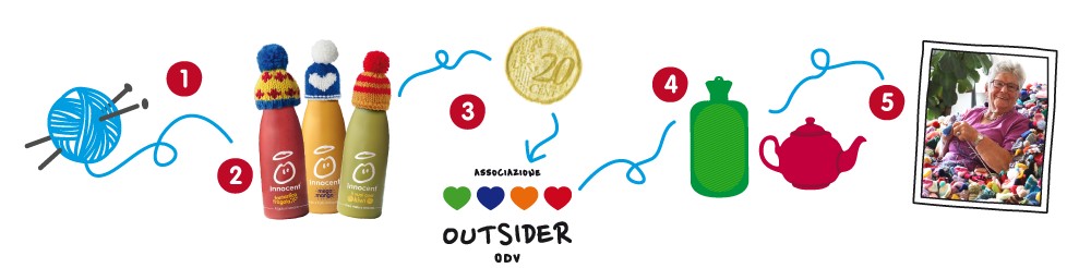 La campagna “Tanto di cappellino” è una vera e propria catena solidale. Ogni inverno, infatti, innocent “veste” le sue bottigliette di succo di tutto il mondo, con tanti minuscoli cappellini di lana. Per realizzarli, vengono coinvolti tutti coloro che avranno voglia di sferruzzarli e spedirli direttamente a innocent, che li userà per adornare le proprie bottigliette. Per ogni bottiglia venduta con il suo cappellino, originale e unico, verranno versati 0,20€ all’Associazione Outsider di Torino, Onlus che si occupa di sostenere, incoraggiare e supportare l’integrazione sociale di persone con disabilità e in condizione di svantaggio.