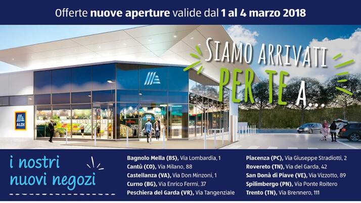 L’ingresso di ALDI in Italia avviene in seguito a un’attenta preparazione che, in due anni, ha permesso all’azienda di definire un piano di sviluppo che prevede l’apertura di più di 45 punti vendita nel Nord Italia entro la fine del 2018. Giovedì 1 marzo apriranno al pubblico i primi 10 negozi, distribuiti nei comuni di Bagnolo Mella (BS), Cantù (CO), Castellanza (VA), Curno (BG), Peschiera del Garda (VR), Piacenza, Rovereto (TN), San Donà di Piave (VE), Spilimbergo (PN), Trento. Inoltre, l’arrivo di ALDI ha già dato un impulso all’occupazione nel Paese: a oggi il brand ha assunto oltre 880 collaboratori, con la prospettiva di chiudere l’anno con più di 1.500 assunzioni.