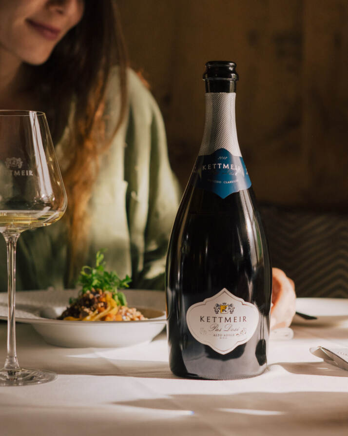 Eleganti e raffinate, le bollicine del Metodo Classico Kettmeir sprigionano già al primo assaggio un’intensa aromaticità e una freschezza deliziosa. Il Pas dosè dal colore giallo paglierino brillante, con un perlage molto fine, intenso e persistente. Il bouquet abbraccia note di fiori gialli e di frutta a polpa gialla sia fresca che matura con note di banana e mango e con sfumate note di lievito. In bocca freschezza e dinamicità, con una carbonica finissima e avvolgente, integrata nella sensazione di energia e plasticità trasmessa dalla lunga sosta sui lieviti, con note floreali, frutta matura e croccante ed erbe aromatiche a esaltare in un lungo finale il carattere luminosamente alpino.
