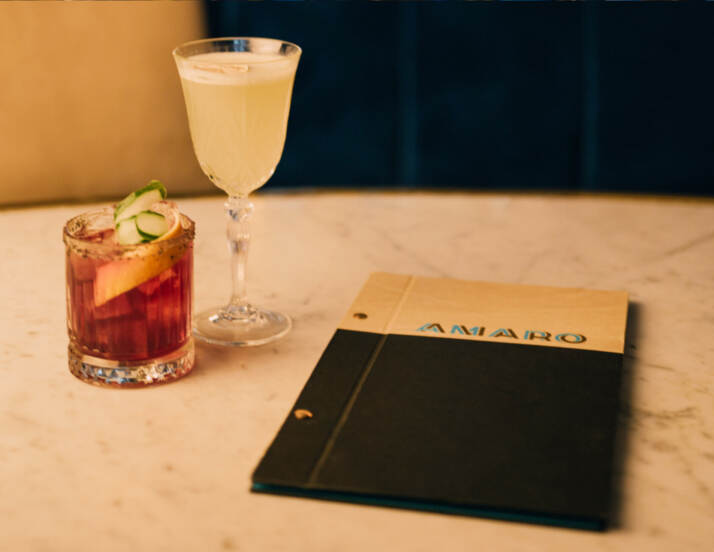 La drink list elaborata dal bar manager, Abram Codazzo, si snoda dunque fra grandi classici e proposte esclusive, per soddisfare ogni esigenza, lasciandosi guidare come stella polare dal gusto amaricante. D’altronde, nomen omen, siamo pur sempre da Amaro.  E già nel nome acquisito si ribadisce con vigore una appartenenza genealogica a quel gusto tipico delle latitudini mediterranee. Chi cerca un approdo sicuro può dirigersi verso un sempreverde Martini Cocktail o un inossidabile Negroni. Oppure dirottarsi verso un Margarita o un Daiquiri, piuttosto che un Paloma o un Mojito, mentre per gli amanti della vodka, Moscow Mule, Bloody Mary o Cosmopolitan.