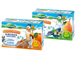La corretta alimentazione dei bambini e la loro salute sono obiettivi importanti per VALFRUTTA che vuole favorire il consumo di frutta tra i più piccoli, coinvolgendoli sempre in occasioni ludiche e di gioco. La gamma I TRIANGOLINI, la grande novità nei succhi di frutta dedicati ai bambini lanciata con successo oltre un anno fa, e rinnovata nel maggio scorso con una nuova collezione, si arricchisce ora di un’altra serie – “Amici d’Inverno” – con simpatici e allegri personaggi legati appunto all’inverno e riprodotti sui singoli brik da 100 ml.