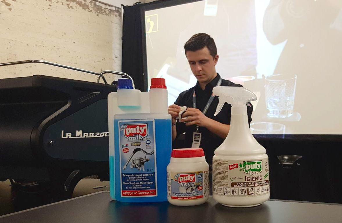 C’è poi la linea “green” realizzata con ingredienti ancora più raffinati e rinnovabili, che comprende pulyGRIND, i cui cristalli a base di amidi alimentari privi di glutine liberano le macine e la camera di macinatura dai depositi di caffè vecchio e rancido; pulyGRIND Hopper, pulitore della tramoggia (campana) e del dosatore; pulyBAR Igienic, adatto alla pulizia delle superfici in acciaio, piani di lavoro, carrozzerie di macchine per caffè, vetrinette, e pulyCAFF Green Power, la variante a pulyCAFF senza fosfati.