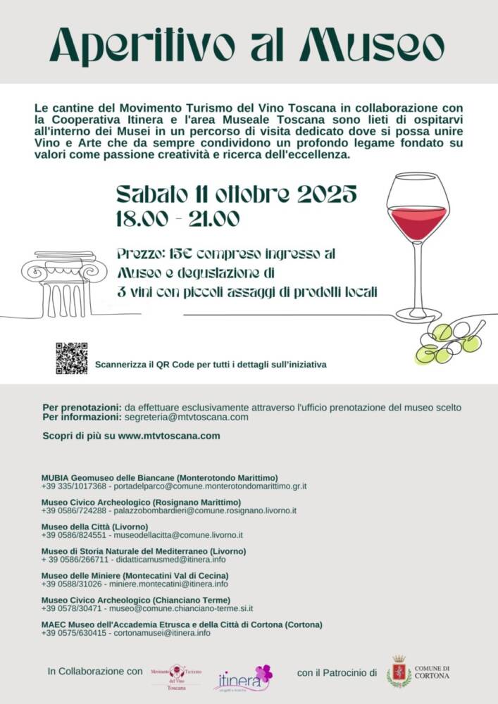 Ogni museo prevede una visita guidata agli spazi museali, seguita da una degustazione di vini delle cantine che saranno presenti con il produttore in abbinamento a prodotti tipici. Le cantine partecipanti avranno anche la possibilità di far conoscere e vendere le proprie bottiglie ai visitatori. I musei che apriranno le porte saranno il MUSMED di Livorno con la visita alle sale espositive e all’Orto Botanico, con particolare attenzione alla sezione dedicata ai fruttiferi antichi, sempre a Livorno il Museo della Città con visita alla collezione civica d’arte contemporanea con opere di Guttuso, Fontana, Burri e tanti altri protagonisti. Il Museo Civico Archeologico di Chianciano Terme offrirà una visita, della durata di circa un’ora, concentrate principalmente nelle sezioni legate alla produzione del vino e al simposio. Il MUBIA di Monterotondo Marittimo con visita alle collezioni museali alla scoperta della geotermia e del viaggio dalla scoperta dell’acido borico alla produzione di energia elettrica. Al Museo delle Miniere di Montecatini Val di Cecina si svilupperà un affascinante viaggio per conoscere le tecniche di estrazione e le storie dei minatori. Il Museo Civico Archeologico ‘Palazzo Bombardieri’ di Rosignano Marittimo con la visita alle collezioni museali con particolare attenzione al materiale relativo a Vada Volaterrana, l’antico porto etrusco poi romano. Il Maec di Cortona invece offrirà un approfondimento sulle sezioni archeologiche e sui materiali legati al simposio e al consumo di vino, come ad esempio la celeberrima tabula cortonensis. I programmi delle visite e degustazioni di Aperitivo al Museo sono pubblicati sul portale ufficiale www.mtvtoscana.com