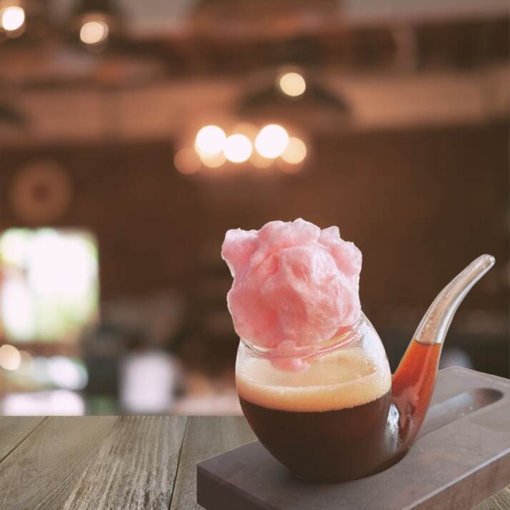 Per la realizzazione del Coffee Smoking prendete uno shaker e, dopo averlo raffreddato, versate al suo interno tutti gli ingredienti. Riempite lo shaker colmo di ghiaccio, chiudetelo e shakerate energicamente per circa 7-10 secondi. Apritelo e filtrate il liquido in un bicchiere a forma di pipa precedentemente raffreddato con l’aiuto di uno strainer e di un colino da cucina (tecnica definita Double Strain). Decorate con dello zucchero filato alla fragola.
