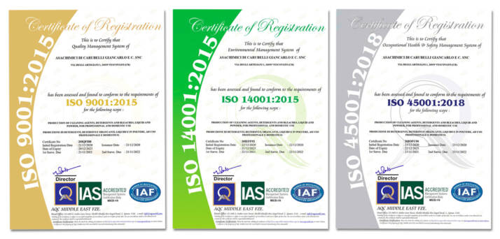 Le tre certificazioni ottenute da Asachimici per la produzione di detergenti, detersivi e sbiancanti, liquidi e in polvere, ad uso professionale e domestico: