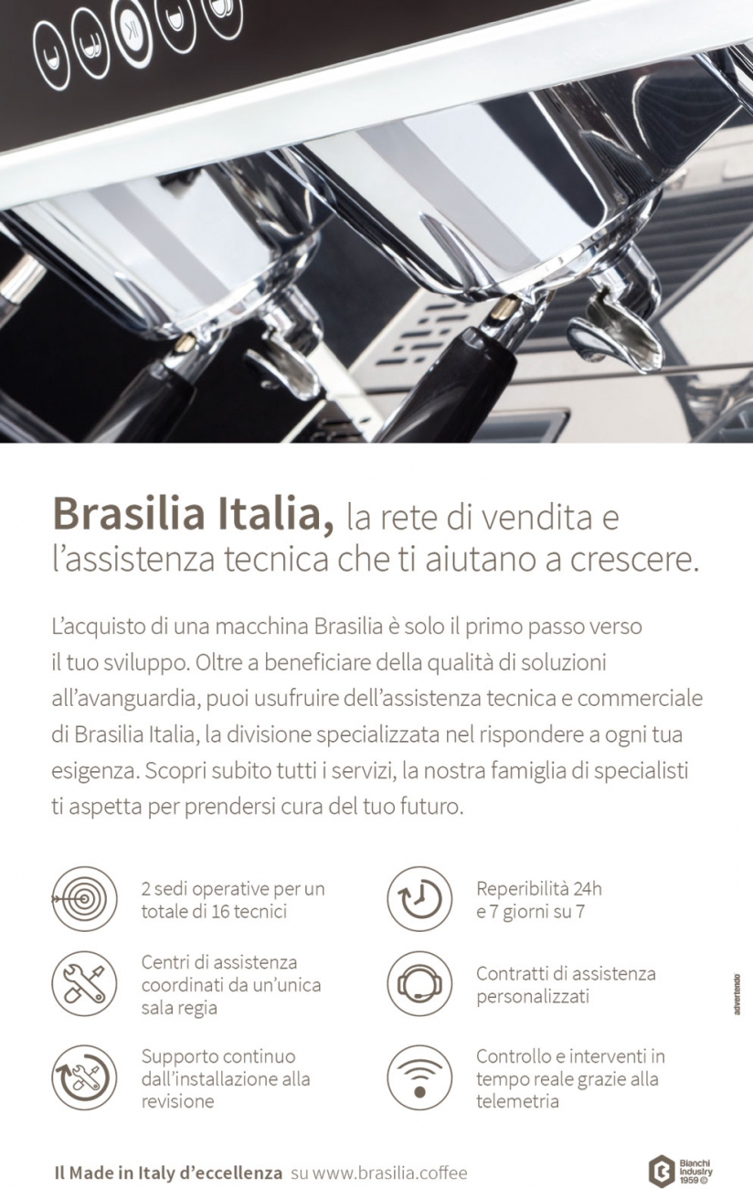 Reperibilità 24 ore su 24 e 7 giorni su 7, centri di assistenza dislocati in tutta Italia e organizzati da una sala regia dotata delle più moderne tecnologie di controllo, una squadra di tecnici specializzati sempre disponibili: questi i punti di forza di Brasilia Italia, la nostra divisione interna impegnata nel fornire un servizio clienti capillare, affidabile e tempestivo a tutti i bar, ristoranti, hotel e torrefattori che ci hanno scelto.