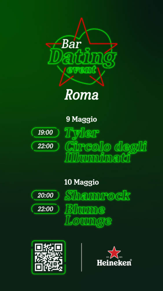 Per continuare a incoraggiare i giovani a uscire dalla propria comfort zone e a lasciarsi conquistare da nuovi bar, per una vita sociale più ricca e appagante, dopo il lancio della web app Bar Dating, Heineken® promuove gli imperdibili eventi Bar Dating, con l’obiettivo di offrire ai partecipanti l’opportunità di scoprire nuovi locali, divertirsi e socializzare in modo originale. Le date prenderanno il via a Roma, con 2 serate speciali venerdì 9 e sabato 10 maggio, in 4 locali della Capitale. Seguiranno altre due serate a Milano nel weekend del 16-17 maggio.