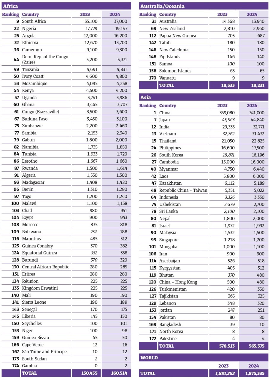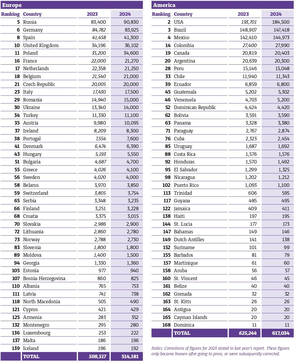 Nel 2024 la classifica dei primi dieci produttori conferma la crescita del Sud Africa, che supera il Regno Unito e sale al 9° posto con 37,0 Mio hl. Il Regno Unito, in aumento del 5,6%, si colloca invece al 10° posto, tornando comunque nella Top 10 dopo anni di assenza.