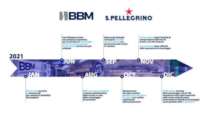 A febbraio 2021, i dialoghi sono proseguiti con l’analisi tecnica e realizzazione di un programma di Dismantling Line. A giugno 2021, Sanpellegrino ha ricevuto da BBM Service la proposta economica per un servizio di smontaggio chiavi in mano e acquisto di macchinari che il Gruppo non avrebbe reimpiegato in altre linee. Ad agosto 2021 BBM ricevuto l’ordine ed ha iniziato la pianificazione delle risorse necessarie; a settembre, sono riprese le riunioni con tutti gli attori coinvolti, per definire le attività. Gli incontri relativi la sicurezza e la prevenzione del rischio in cantiere sono stati particolarmente accurati. A questo proposito, si ringrazia CSTA Srl per la professionalità nella promozione della cultura di sicurezza in cantiere.