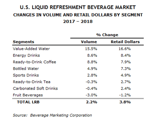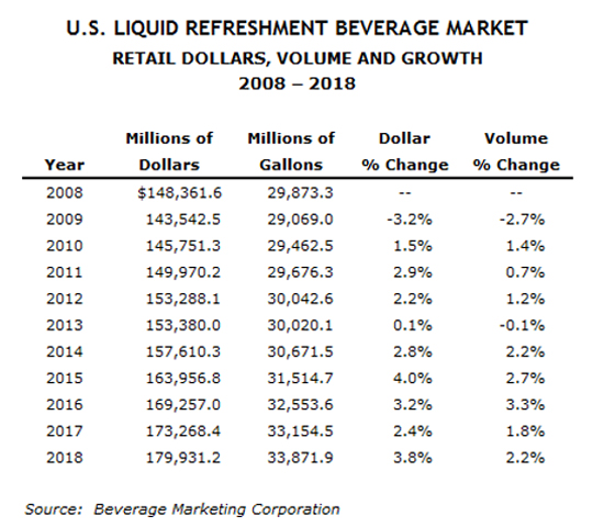 Il mercato statunitense delle bevande rinfrescanti analcoliche (acque, bibite carbonate, bibite lisce, energy e sport drink, succhi e bevande frutta) è cresciuto di nuovo nel 2018, con vendite totali al dettaglio pari a 180 mld/$ (in aumento del 3,8%) e 128 mld di litri (in aumento del 2,2%), secondo i dati rilasciati da Beverage Marketing Corporation.
