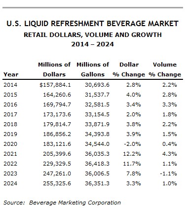 Dopo aver superato i 36,4 miliardi di galloni (138 miliardi di litri) nel 2022, il volume totale delle bevande rinfrescanti liquide era sceso a 36 miliardi di galloni nel 2023, prima di risalire a quasi 36,4 miliardi di galloni nel 2024. Le vendite al dettaglio sono passate da 247,3 miliardi di dollari nel 2023 a 255,3 miliardi di dollari, con un aumento del 3,3%. Solo tre segmenti di bevande rinfrescanti liquide hanno registrato un aumento dei volumi nel 2024 e tutti tranne uno hanno registrato aumenti delle vendite.