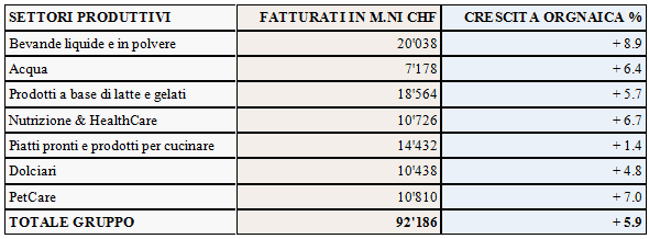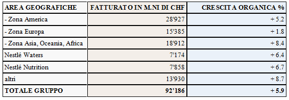 La crescita del Gruppo Nestlé è stata diffusa e generale in tutte le categorie e aree geografiche, con un 5,9% di crescita organica nella Zona America, 2,4% in Europa e 10,3% in Asia, Oceania e Africa. Nonostante un contesto commerciale difficile nei mercati sviluppati, l’innovazione in prodotti, sistemi e canali di distribuzione ha portato ad una crescita organica del 2,5%. Nei mercati emergenti il gruppo è cresciuto dell’11%.