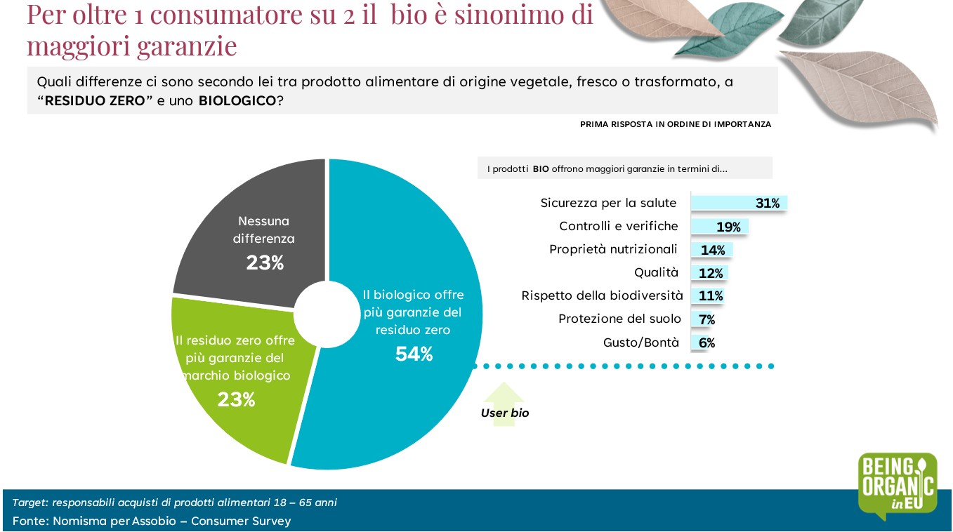 In questo contesto, nonostante la maggioranza degli italiani sia perfettamente consapevole delle maggiori garanzie offerte dal marchio biologico (54%), si rileva comunque una quota del 23% di consumatori che considera le referenze senza residui del tutto simili ai prodotti biologici e un ulteriore 23% che ritiene addirittura superiori le garanzie offerte dal claim rispetto al sistema produttivo bio certificato.
