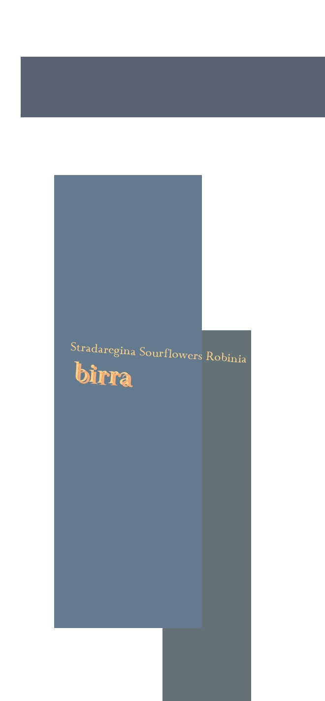 Tipologia / Stile: Lambic, Fruit Sour Beer, stagionale con fiori di Robinia Colore: Chiara Gradazione: 5,50% Alc. Regione: LOMBARDIA Sito Web Prodotto: www.birrificiostradaregina.weebly.com