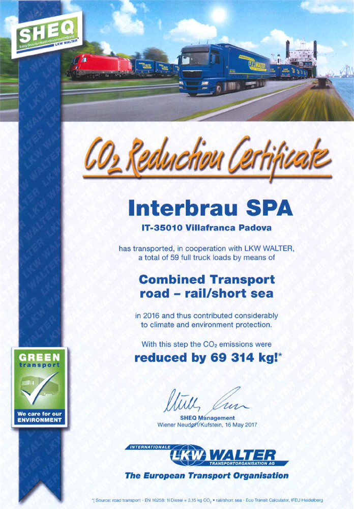 Nello specifico, il certificato “Green Transport” assegnato a Interbrau attesta che sono stati ben 59 i camion a pieno carico risparmiati, i quali avrebbero immesso in natura 69.314 Kg di anidride carbonica.