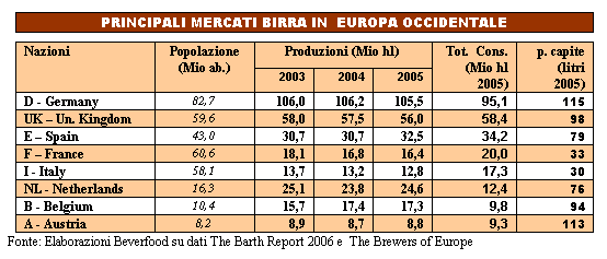 Sono ormai disponibili i dati consuntivi della produzione e dei consumi birrai 2005 per i principali mercati europei, che confermano le tendenze di fondo che si stanno manifestando oramai da qualche anno.