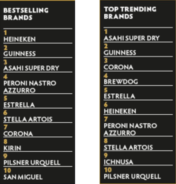 Al terzo posto della classifica Best Selling Brands dei migliori bar del mondo si colloca la giapponese Asahi Super Dry, che rafforza la sua posizione con il quarto posto della Peroni Nastro Azzurro (della controllata Peroni italiana). Asahi Super Dry è inoltre in vetta alla classifica delle Top Trading Brands.