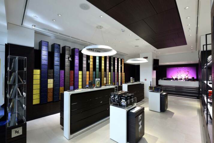 Il nuovo concept rappresenta una vera e propria celebrazione del caffè: dalla rilassante palette di colori con ricche tonalità di marrone e con gradazioni di oro che tende al crema, fino alle lampade che richiamano quelle usate nelle piantagioni di caffè. Il tutto basato su alcuni principi fondamentali: il percorso semplice e olistico del cliente attraverso aree che seguono una sequenza ben precisa; la celebrazione del coffee moment grazie a rituali creati su misura; nuovi codici architettonici che creano un’atmosfera calda, accogliente ed estremamente raffinata; un ecosistema physical-to-digit privo di interruzioni che collega le vendite tramite App alla destinazione del commercio al dettaglio, compreso un sistema di fila virtuale e selettori digitali del caffè. Grazie alla combinazione di tutti questi elementi, la vendita si trasforma in una immersione totale nell’esperienza del brand.