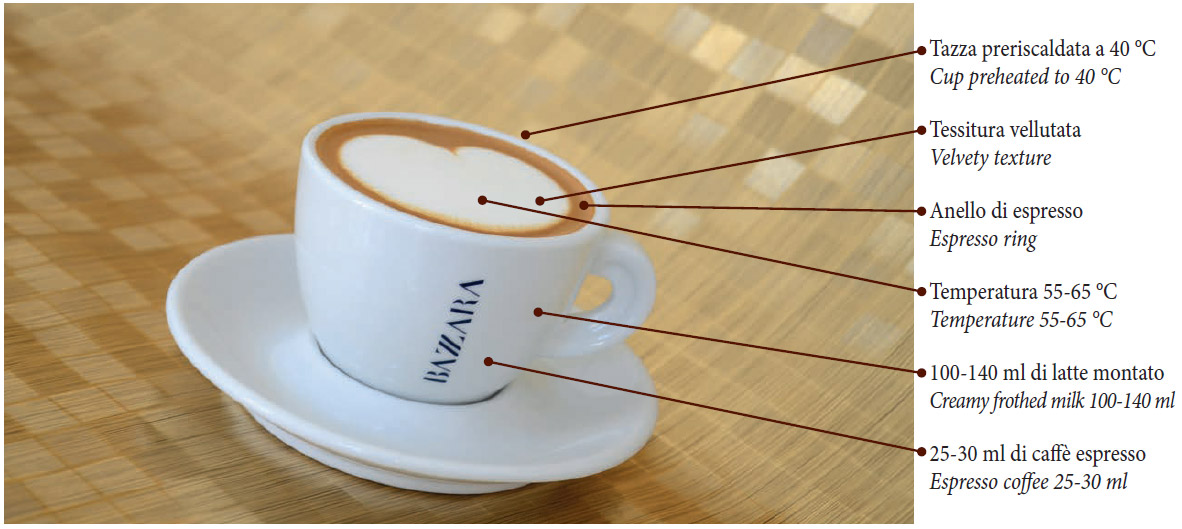 Oltre al latte, aggiungeremo l’espresso, da prepararsi in contemporanea al latte, a una temperatura in tazza attorno ai 60-65 °C.