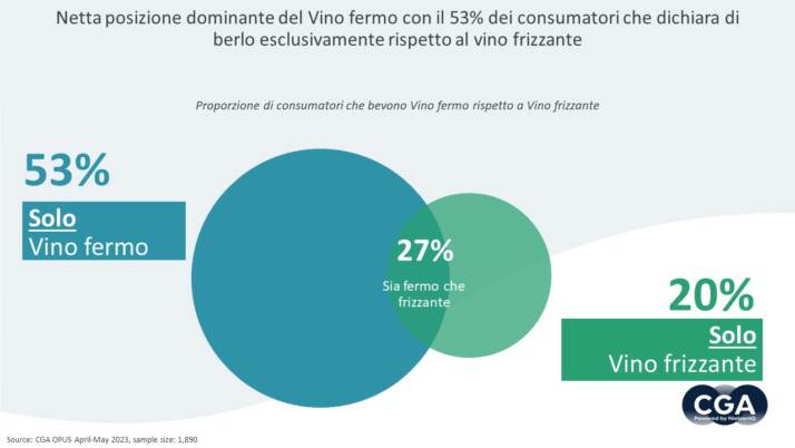 Nel Belpaese il vino fermo traina la categoria: lo scelgono infatti 3 consumatori su 4 (75%). Vino frizzante (44%) e vino da dessert (28%) si posizionano al secondo e terzo posto. Inoltre, il vino fermo se paragonato al vino frizzante detiene una posizione dominante con il 53% dei consumatori che dichiara di berlo esclusivamente rispetto alle bollicine.
