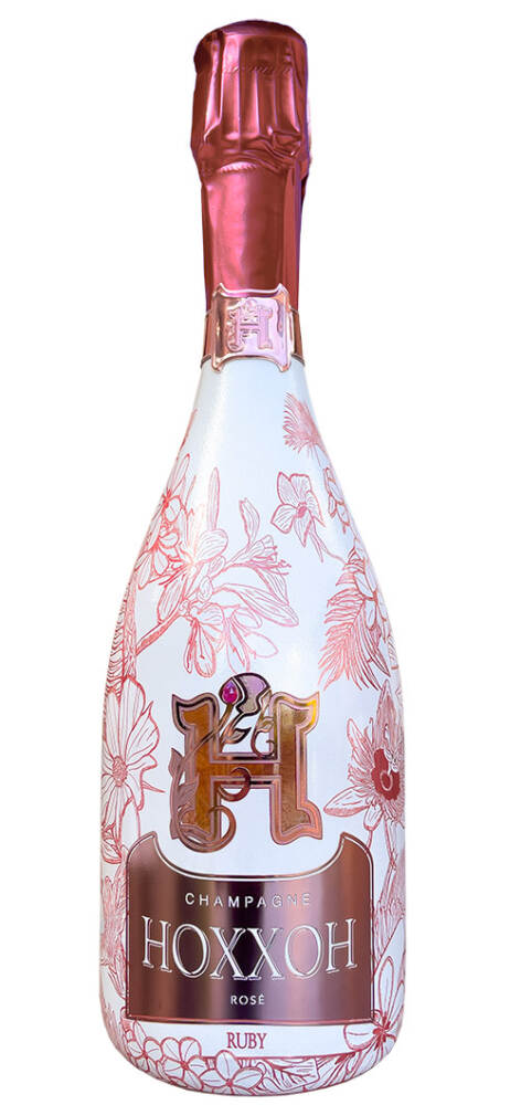 Sull’etichetta centrale di ogni bottiglia di Champagne Hoxxoh Ruby è inserito un rubino naturale di 0,45 carati. Corindone, rosso, a forma di pera. Rifrazione: 1.760 – 1.770 biref 0.010, peso specifico 4.00. Le bottiglie sono completamente luminose e seguono il ritmo della musica. Colore rosa chiaro brillante e bollicine vivaci fini e molto persistenti. Al naso puro e floreale con sentori di petali di rosa, bacche rosse fresche, agrumi maturi e un po’ di nocciola tostata. Buona presa al palato, frutta giovane con alcune note fruttate autolitiche di macerazione sulle bucce, brioche e burro con lampone schicciato, agrumi rossi, una consistenza cremosa struttura con acidità brillante e un lungo finale. Uno champagne vinoso, grazie a una tecnica di vinificazione con la spremitura soffice tradizionale dello Champagne. Pulizia delle fecce tramite travasi a decantazione per gravità naturale. Fermentazione alcolica tra 16° e 20°. Affinamento sui lieviti, fermentazione malolattica parziale, vinificazione del vino rosso in tini aperti, uve diraspate a mano. Vitigno 97% Chardonnay 3% Pinot noir, dosaggio 9 g/l e gradazione 12,5%.