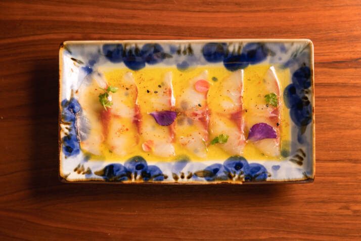 Il menu della Serata ha visto una selezione di piatti che hanno esaltato la contaminazione culinaria. Si è partiti con Cristalbread di Chef Ernst Knam, con alici marinate, maionese con confit di pomodoro e peperoncino di Aleppo. A seguire Shiromi Kobujime di Chef Wicky Priyan, carpaccio di branzino con salsa di limone Nichinan, 7 spezie di Miyazaki e olio di oliva Leccino. Spazio ancora a Chef Ernst Knam, con Filetto di Triglia Croccante, a base Triglia con salpikon di caco, yuzu, frutto della passione e vaniglia Tahiti. Un viaggio dall’altra parte del globo con il Japan Burger targato Chef Wicky Priyan, Burger nero con crocchette di Wikakuni, salmone di Tokyo marinato in soia e zenzero, scarola, maionese di barbabietola, vinaigrette di acciughe e olive nere.