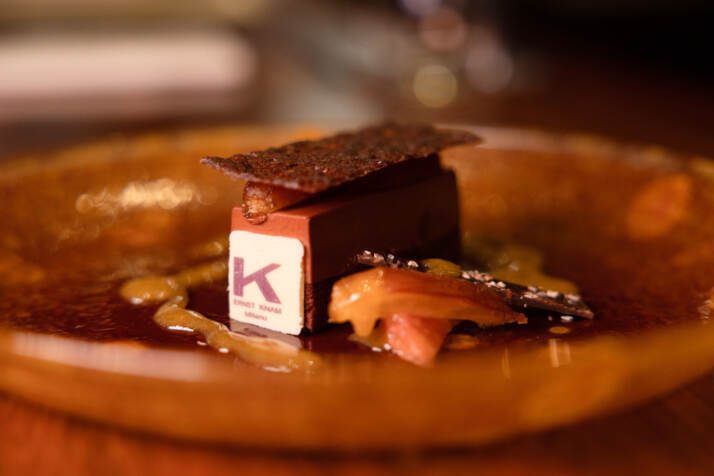 Gran finale dolce con una doppietta di Knam, con Cioccolato Arancia Fudge Cake, Fudge cake con sciroppo al gin Edelweiss, cacao, vaniglia e fava Tonka, mousse al cioccolato Peru Pachiza 70%, Brandy snap, mix di datteri Medjool e filetti d’arancia con marmellata di arancia, foglio di sottilissimo cioccolato con gré di cacao e sale di Maldon. Dulcis in fundo, caffè e piccola pasticceria con cioccolatini con gin Edelweiss, cioccolato Peru Pachiza 70%, uvetta e pepe lungo africano.