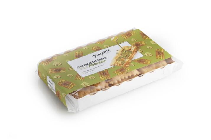 Chiacchiere al pistacchio, al burro di arachidi e al caramello salato 3,99€ (confezione da 250 gr.)
