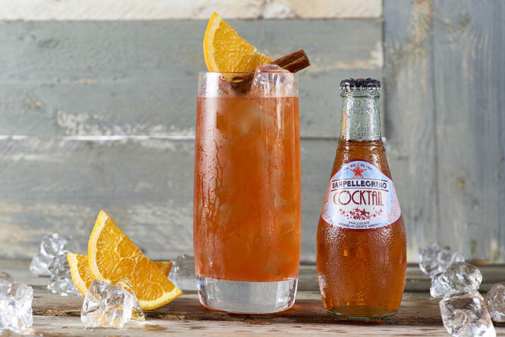 In un bicchiere Juice da 40 cl, precedentemente riempito di ghiaccio, versare gli ingredienti, miscelandoli con un Barspoon, prestando attenzione ad aggiungere il Cocktail Sanpellegrino per ultimo. Per guarnire, decorare con uno spicchio d’arancia e una stecca di cannella.