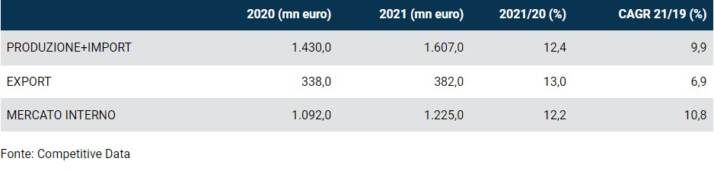 La produzione di cialde e capsule per caffè, che include anche l’importazione di capsule speciali delle multinazionali estere, cresce del +12,4% a valore nel 2021 attestandosi a 1.607,0 milioni di euro. Le esportazioni si attestano a 382,0 milioni di euro, in crescita del +13,0%.