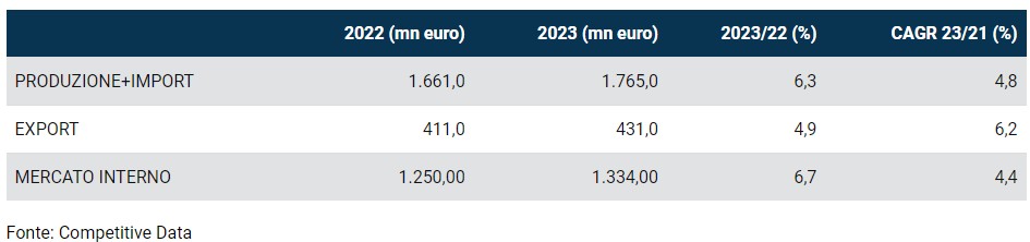 Per il 2024 non prevediamo grandi differenze tra lo scenario base e lo scenario peggiore, con la produzione che in entrambi i casi supererà gli 1,8 miliardi di euro, ed un mercato interno previsto in crescita del +4,2% per lo scenario peggiore e del +6,4% per lo scenario base.