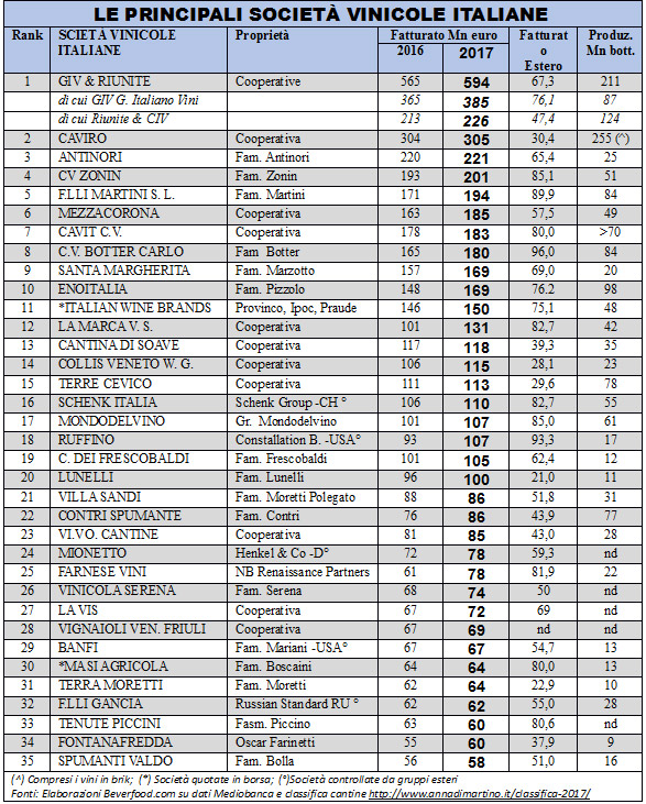 Sette società hanno realizzato nel 2017 un aumento dei ricavi superiore al 10%: La Marca (+30,7%), Farnese (+28%), Ruffino (+15,5%), Enoitalia (+14,5%), Contri (+14,1%), Fratelli Martini (+13,3%) e Mezzacorona (+13,1%). Altre variazioni degne di nota hanno interessato Botter (+9,5%), Mionetto (+8,6%), Collis (+8,4%), Santa Margherita (+7,4%) e Mondodelvino (+6,1%).