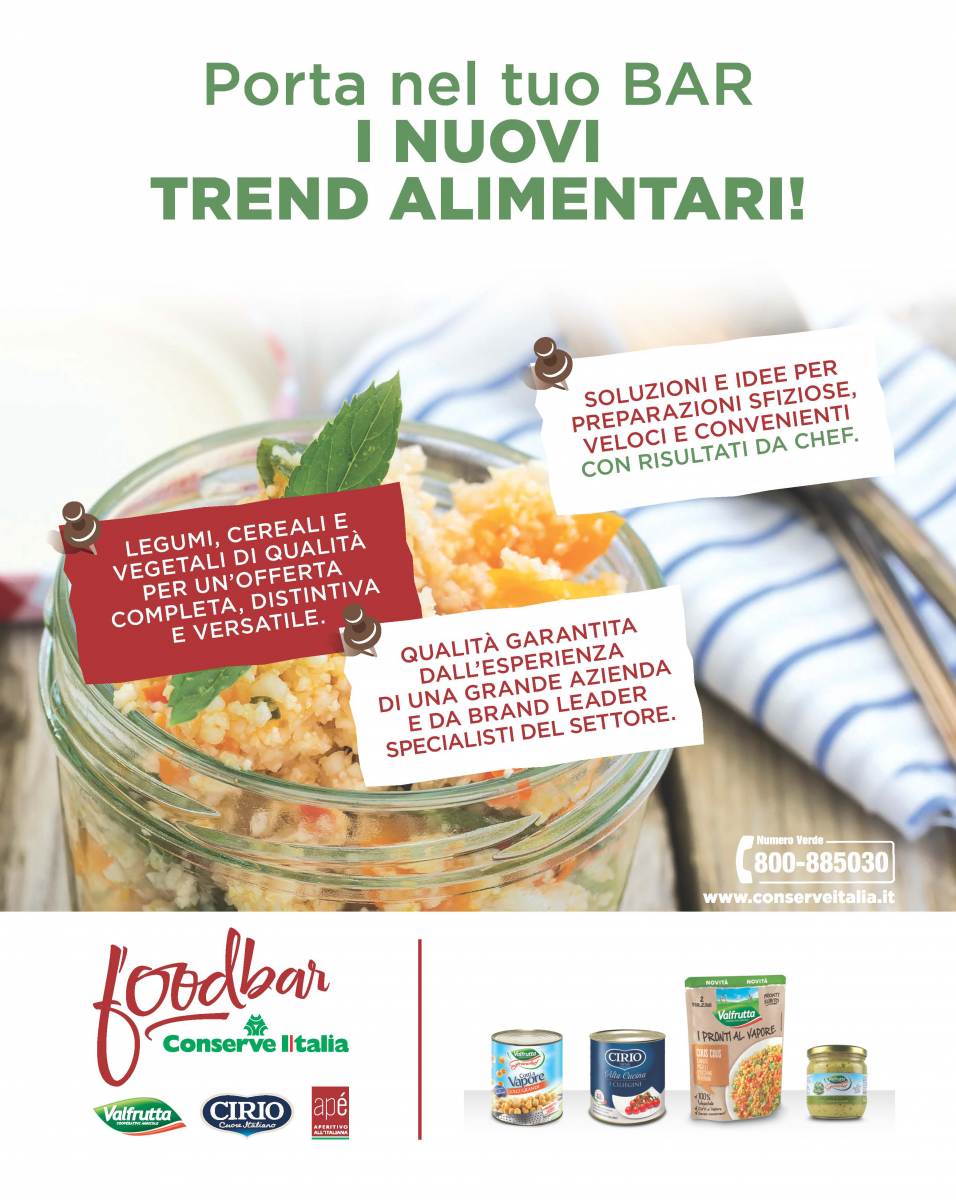 “L’opportunità per il trade – sottolinea Pier Franco Casadio direttore commerciale Horeca Conserve Italiaè quella di rivolgersi al consumatore con una proposta food strutturata, ben articolata e di tendenza che risponde a precise esigenze emergenti”. “Il bar sta cambiando pelle – afferma Gabriele Angeli Direttore Marketing Horeca di Conserve Italiatrasformandosi sempre più spesso in bar multifunzionale, che non è più luogo di consumo esclusivo della colazione, del caffè o al massimo dell’aperitivo ‘all’italiana’, ma sempre di più luogo dove si consuma un pranzo veloce in alternativa alla ristorazione classica. Per gli operatori dell’Horeca è fondamentale intercettare le esigenze del nuovo consumatore, sempre più alla ricerca di soluzioni gustose ma leggere che rispondono all’esigenza di nutrirsi in modo più sano”.