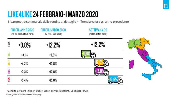 “Non solo le apprensioni relative alla salute, bensì anche necessità di soddisfare consumi domestici aumentati, date le disposizioni di evitare luoghi pubblici affollati, ivi inclusi bar, ristoranti, etc., tutto ciò dà una nuova spinta alla spesa – dichiara Romolo de Camillis, Retailer Service Director di Nielsen Connect in Italia – L’adozione di misure preventive anche in molte Regioni del Mezzogiorno ha impattato il trend di crescita della GDO, che al Sud cresce di 6 punti percentuali in più che nel Nord Ovest. In una situazione eccezionale come quella di oggi, la filiera del largo consumo dimostra grande efficienza e flessibilità, che si traduce nella capacità di soddisfare una domanda anomala.”