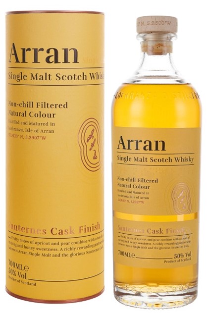 Arran Sauternes Cask Finish è un Single Malt che invecchia per circa 8 anni in botti di rovere americano che in precedenza hanno contenuto bourbon e affina in botti di vino bianco (dolce) Sauternes selezionati nella zona francese del Bordeaux. Imbottigliato senza essere filtrato a freddo, a 50%.