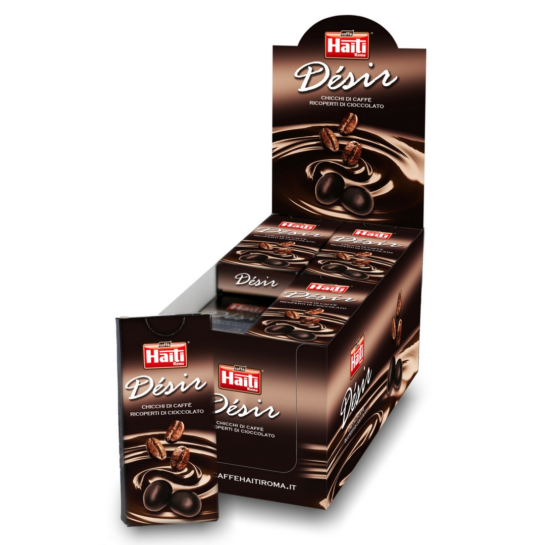 Numerosissimi sono gli esempi di ricette che mostrano l’utilizzo del caffè in abbinamento al cioccolato, ed ampio è il ventaglio delle possibili combinazioni: caffè a prevalenza arabica o in blend, cioccolato bianco o fondente ecc., l’importante è che nella scelta degli abbinamenti l’aroma del primo non copra quello del secondo e viceversa. Inoltre, oltre attraverso la preparazione dei dolci l’esaltazione della famosa bevanda può avvenire anche soltanto grazie al semplice abbinamento ad una pralina, che ne esalti le proprietà organolettiche ed intensifichi il piacere della degustazione. In questo modo il caffè da semplice bevanda diventa un dessert a tutti gli effetti, e per giunta anche con molte proprietà benefiche per la salute. Partendo da quest’ultima affermazione, e proseguendo la tradizione ben nota in molti bar di offrire al cliente una tazzina di espresso fumante con affianco una pralina di cioccolato, Caffè Haiti Roma ha lanciato recentemente un nuovo prodotto in grado di esaltare le sue pregiate miscele: Désir è un chicco di caffè avvolto in pregiato cioccolato fondente, che la storica torrefazione di Roma consiglia in abbinamento a determinate miscele sia in grani che macinate per uso domestico, appartenenti sia alla Linea Tradizionale che a quella Biologica ed Equosolidale, per rendere il piacere dell’espresso al bar o a casa ancora più intenso. Le praline Désir sono disponibili in pratici dispensers posti all’interno di un elegante display, e si possono acquistare sul sito www.caffehaitiroma.it