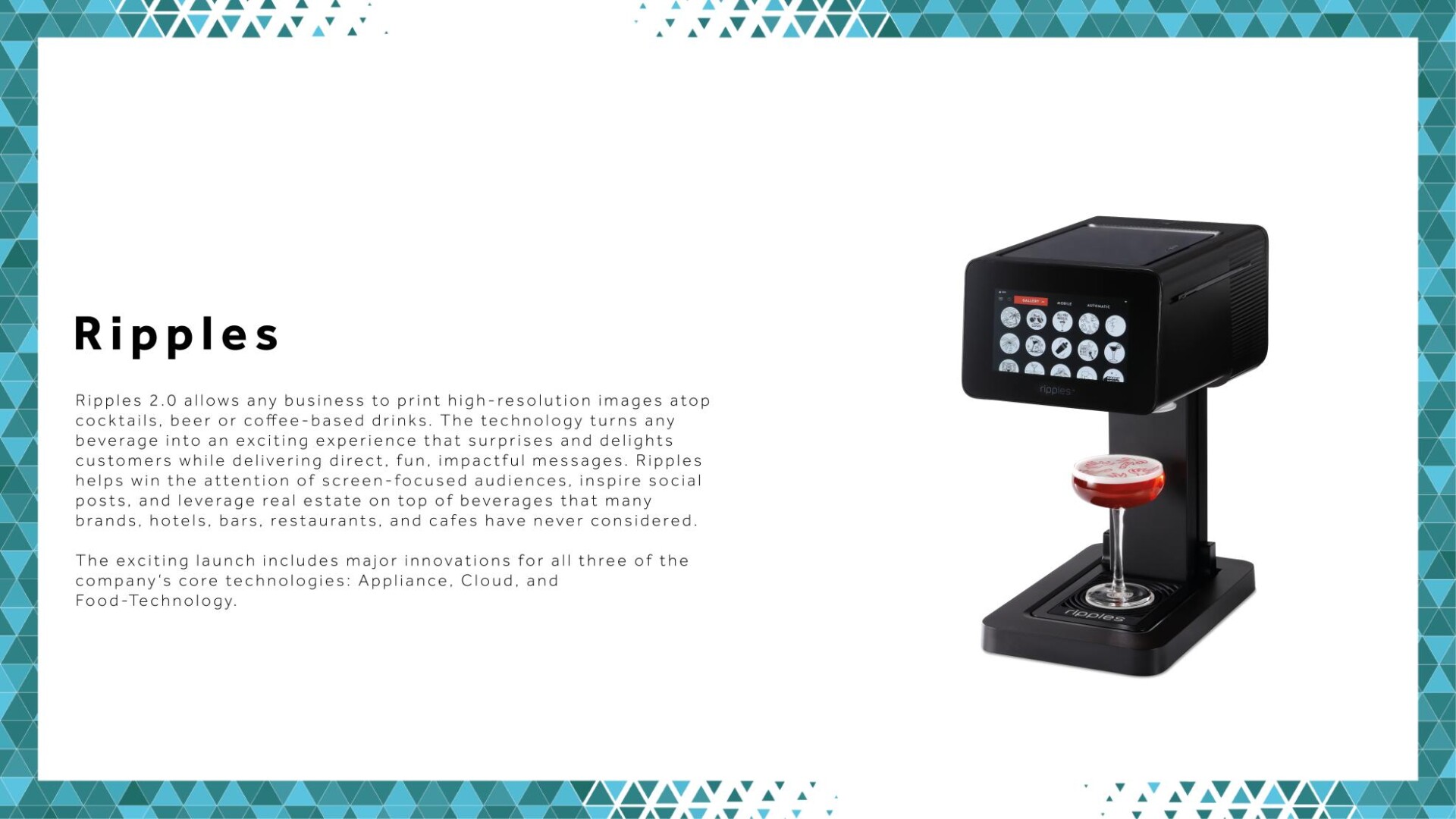 Un’altra divertente novità, derivata dalla collaborazione con Ripples, prevede di poter stampare una qualsiasi fotografia, come un selfie, una scritta o un’immagine, sulla superficie di un cocktail, di una birra o di un drink a base di caffè. Questa tecnologia trasforma una semplice bevanda in un’esperienza unica e diversa e il risultato è talmente incredibile che vale la pena immortalarlo postando una foto sui social.