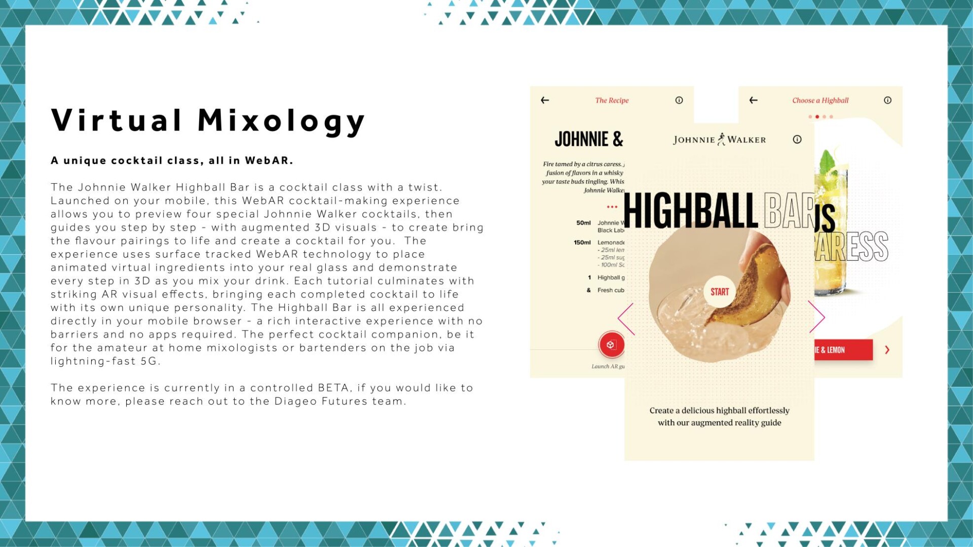 “Taste Of The Future” è quindi uno spazio virtuale totalmente interattivo che consente ai suoi visitatori di svolgere diverse attività. Rispondendo ad alcune domande sulla piattaforma Pinterest, per esempio, gli utenti potranno improvvisarsi mixologist seguendo i consigli e le ricette di cocktail creati appositamente in base ai loro gusti personali. Inoltre, attraverso la tecnologia di realtà aumentata è possibile seguire le istruzioni per ricreare un perfetto Johnnie Walker Highball: ogni singolo step viene infatti mostrato in video, facendo vivere un’esperienza innovativa dal proprio smartphone o tablet.