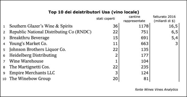 Quali sono i più importanti distributori USA di vino domestico? A questo interrogativo ha risposto Wines Vines Analytics, gruppo di ricerca di Wines & Vines che ha stilato una top ten basata su criteri quali il numero o prestigio di cantine rappresentate, il fatturato, il numero di stati coperti e la percentuale di consumatori interessati, senza però considerare che i distributori abbiano nel portafoglio, oltre al vino, anche birra o spirits.